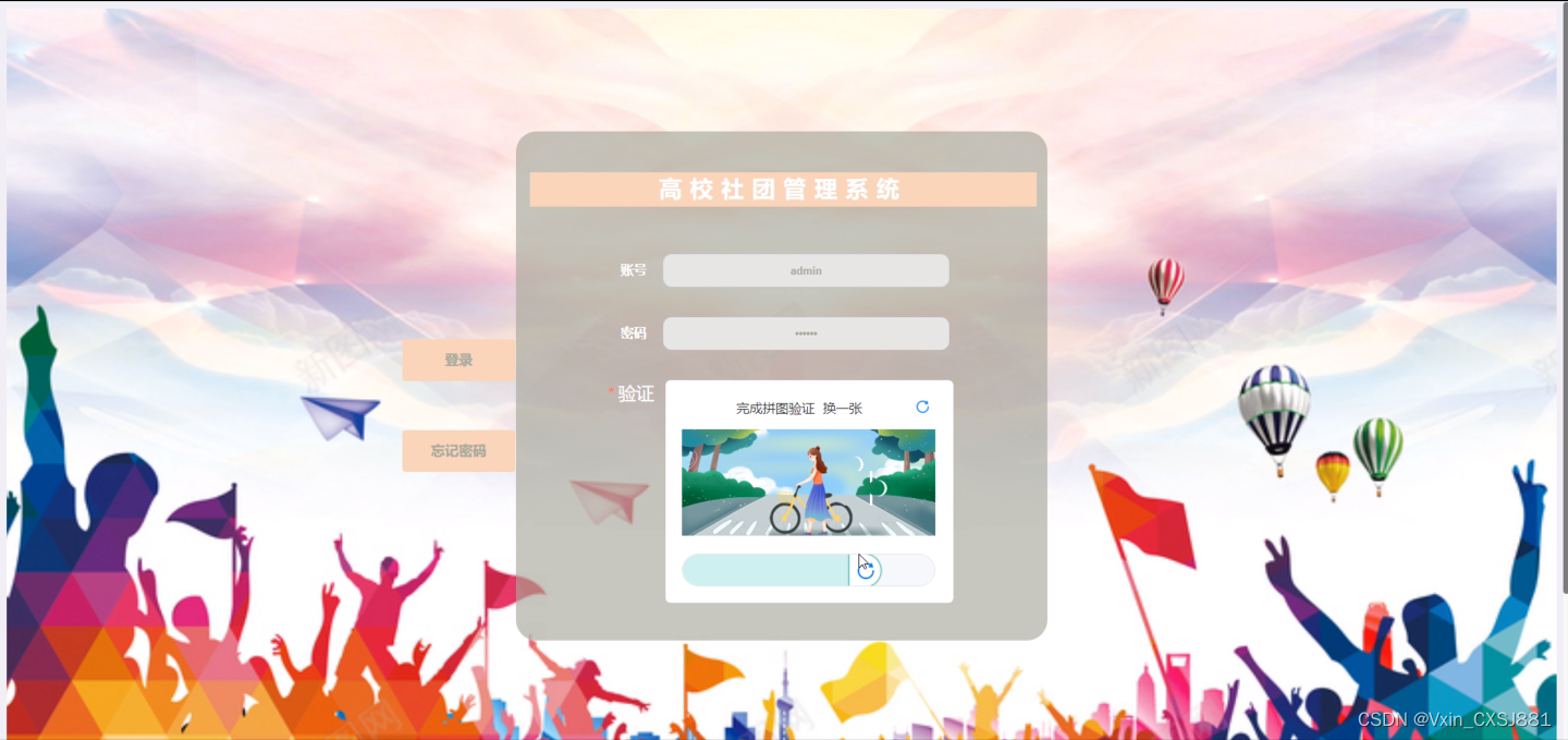 管理员登录,通过填写账号、密码、图片验证,输入完成后选择登录即可进入高校社团管理系统,如图5-1所示。