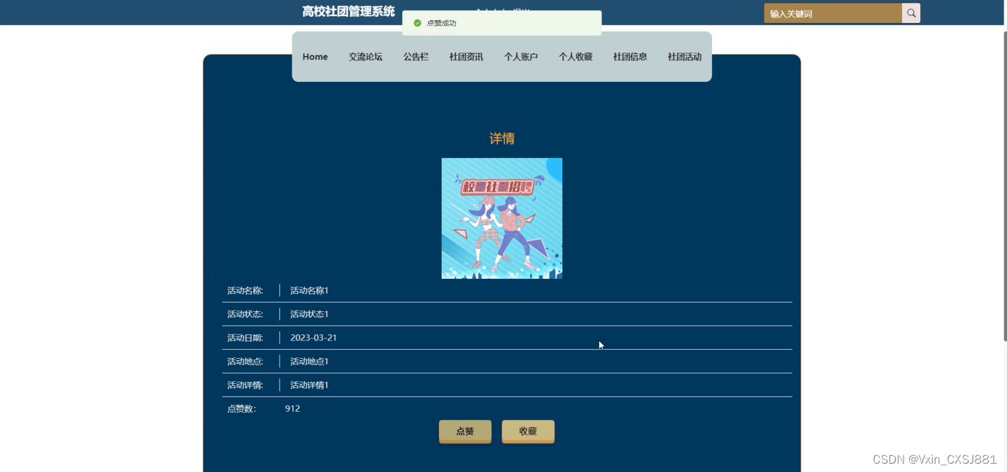 社团活动,在此页面可以查看推荐的社团活动信息,可进行点赞,评论,收藏等操作,如图5-16,5-17所示。