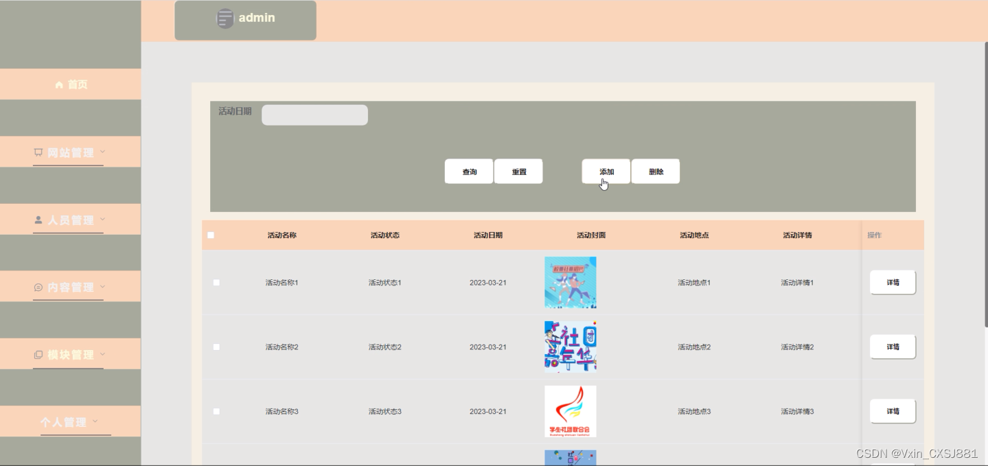 管理员或社团部长在社团活动管理页面可以对活动内容及其分类进行查询,重置,添加,删除等操作,如图5-4,5-4-1所示。