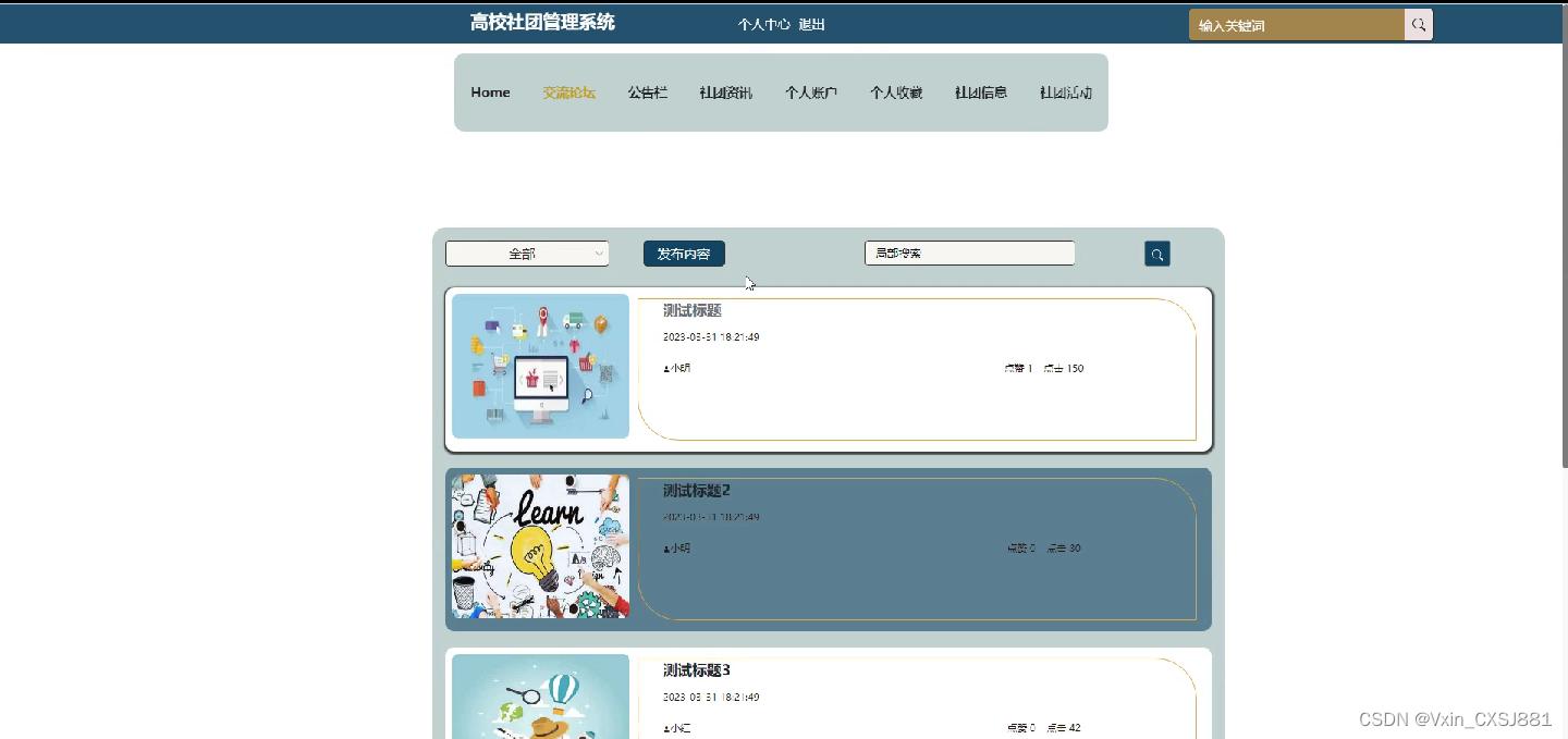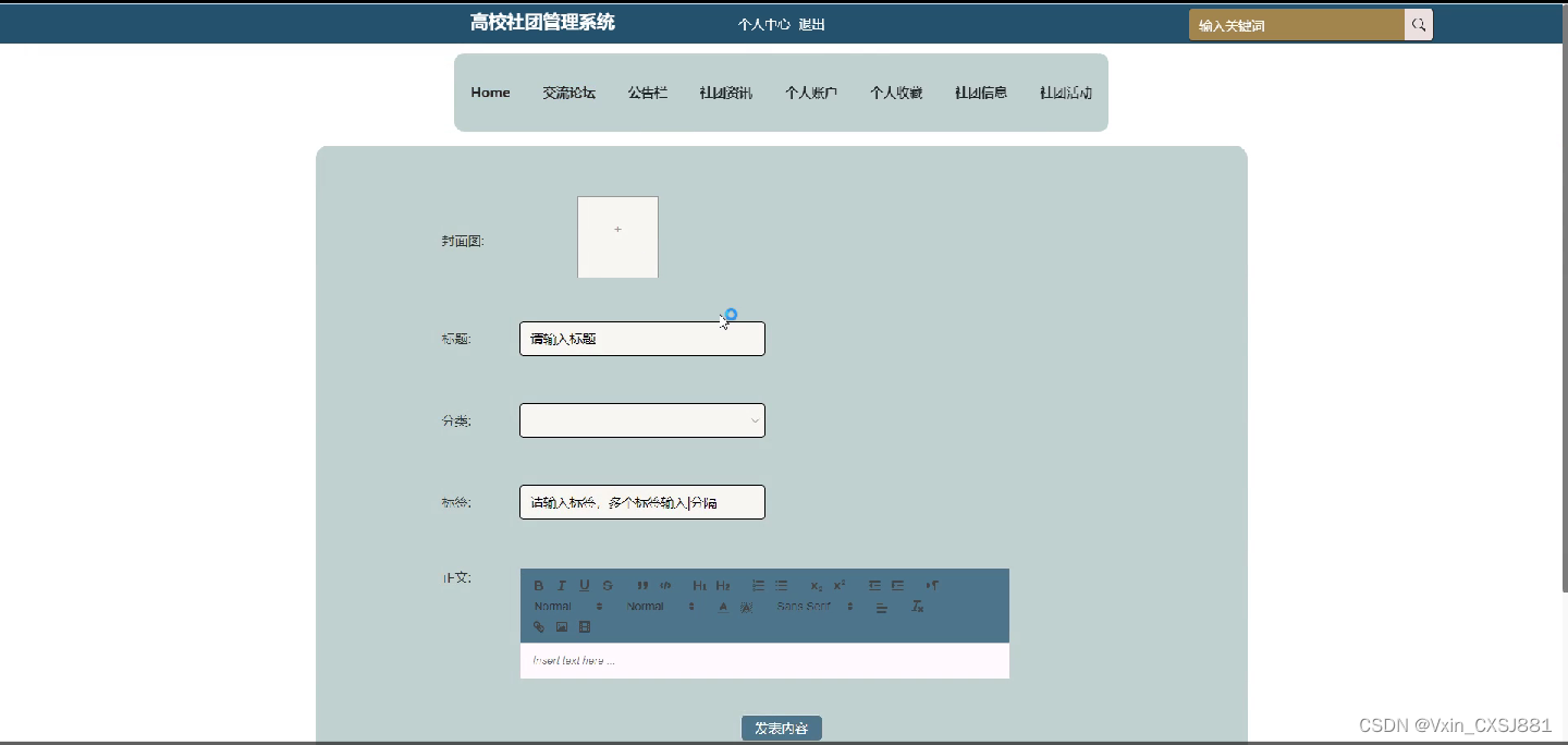 交流论坛:学生在交流论坛一栏可查看论坛帖子,并可编辑标题、标签、分类、封面图等内容进行发布帖子,如图5-12 5-13所示。