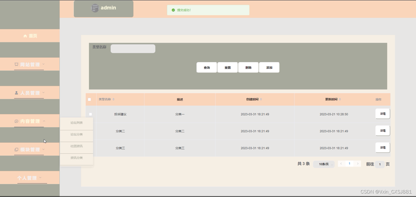 | 删除分类模块 | 分类名:最新通知 | 删除成功、页面自动跳转 | 删除成功、页面自动跳转 | 通过 |
