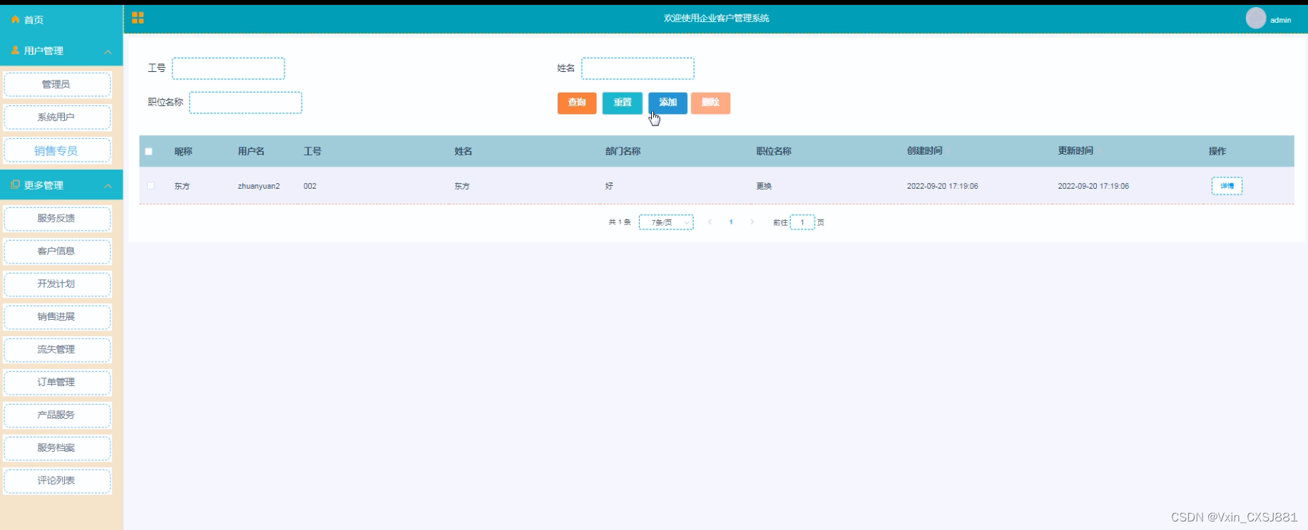 管理员点击进入用户管理页面可以添加销售专员信息,并进行详情、修改、删除操作,如图5-14示。