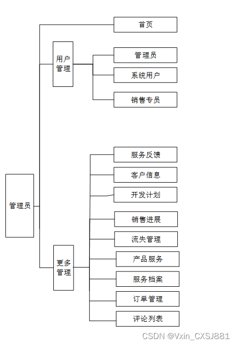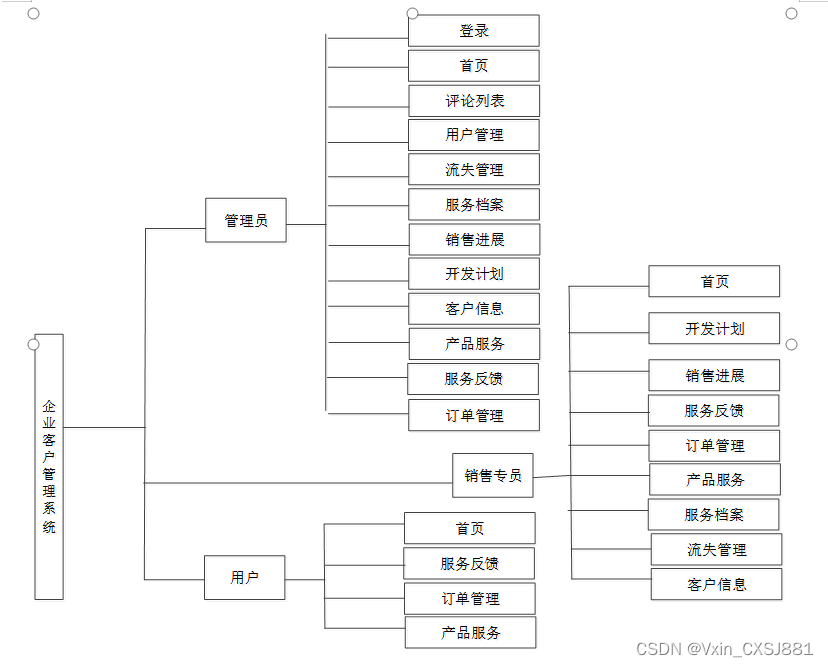 企业客户管理系统的功能主要分为管理员、用户根据自己的需求进行注册登录,浏览订单信息并进行反馈操作。管理员主要对服务反馈、客户信息、开发计划、销售进展、流失管理、订单管理、产品服务、服务档案、评论列表进行处理。