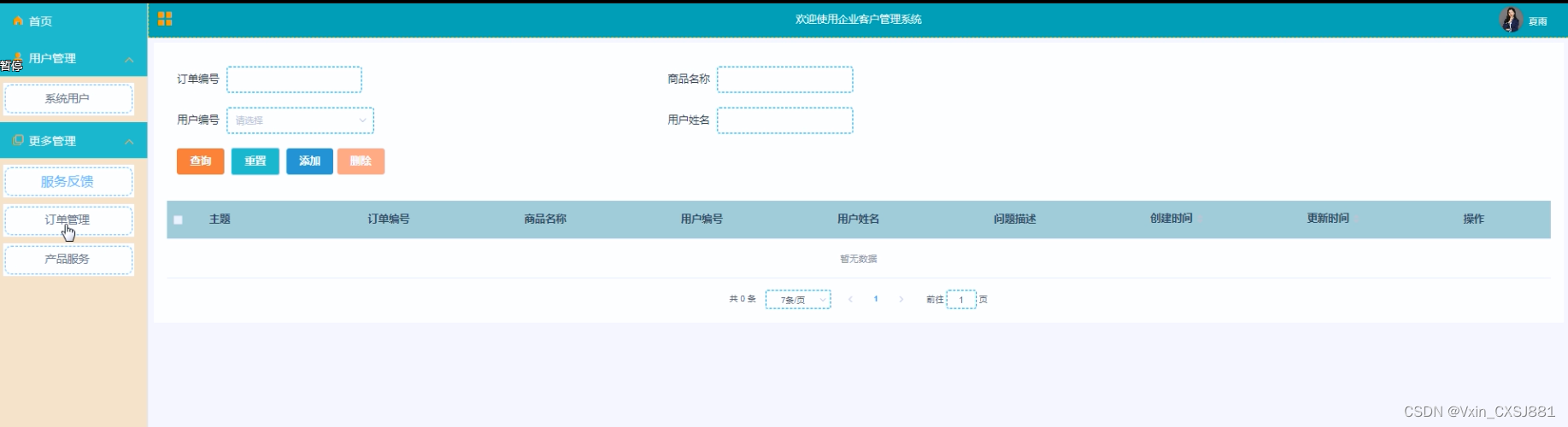 订单管理:对订单信息进行查询、添加、重置、删除等操作。