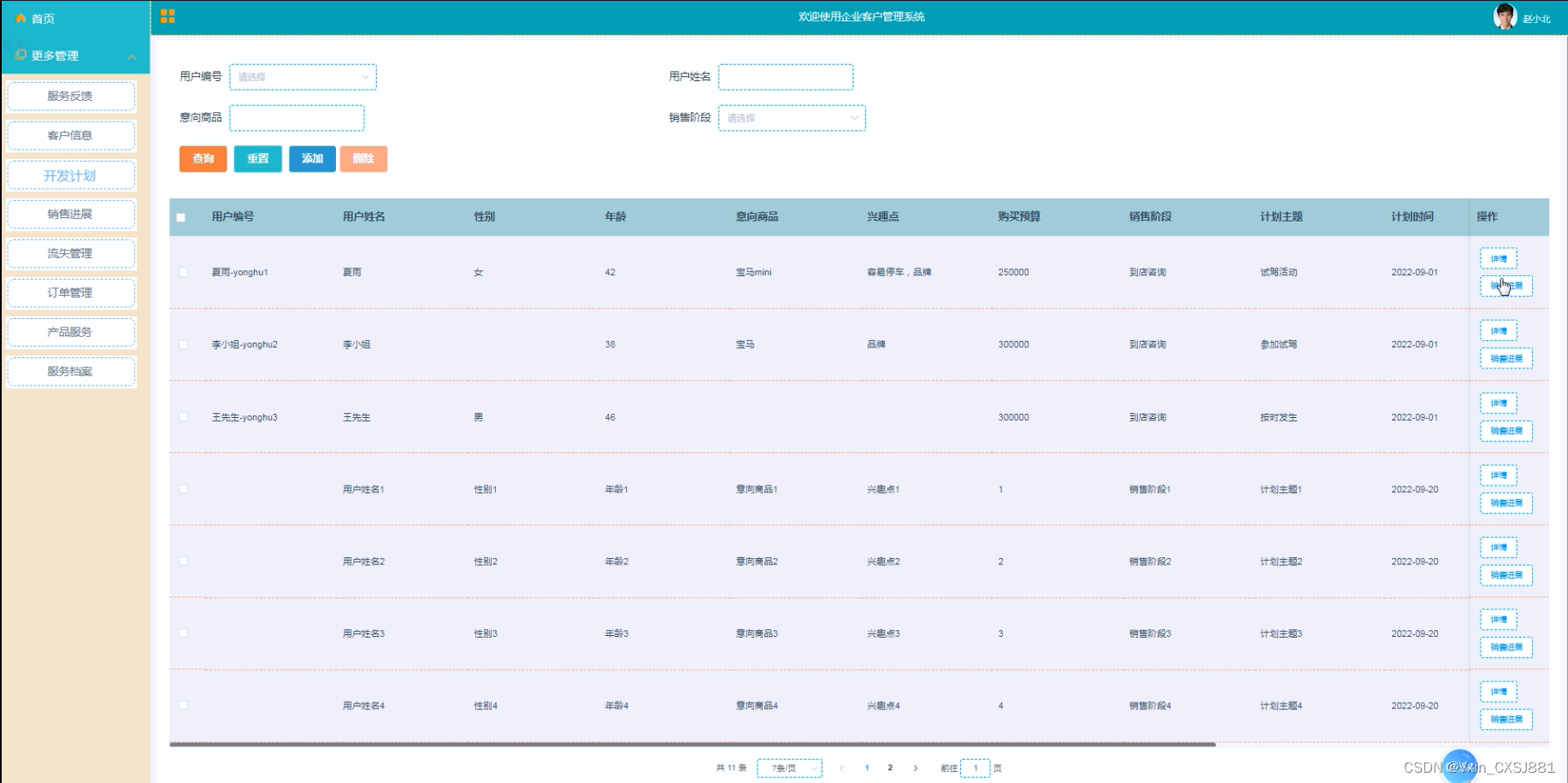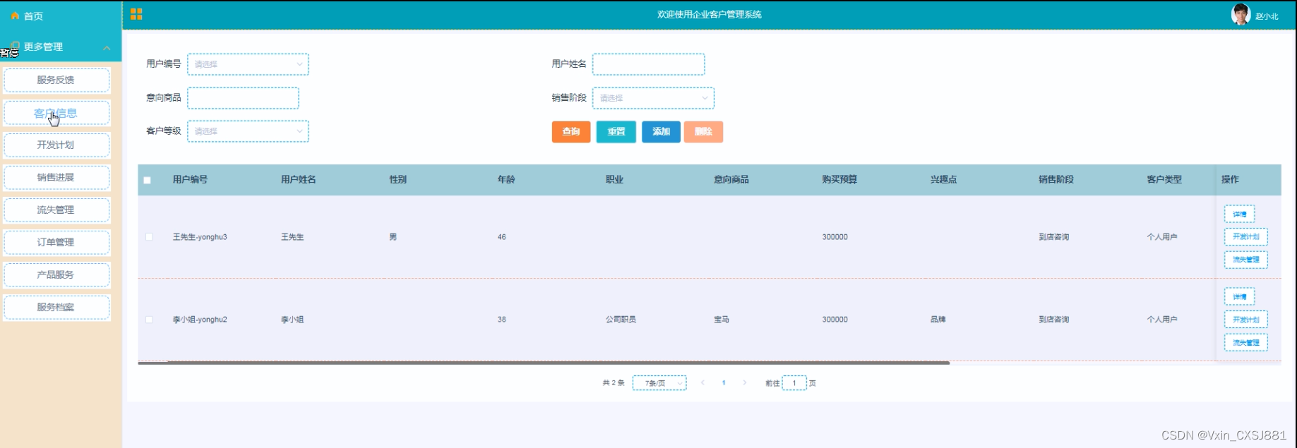 销售专员登录成功之后可以对客户信息进行查询、开发计划、流失管理等操作。