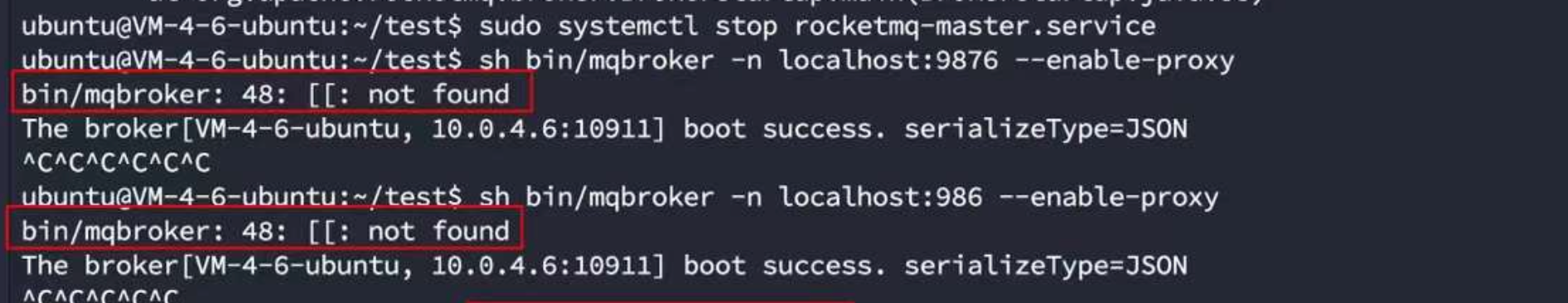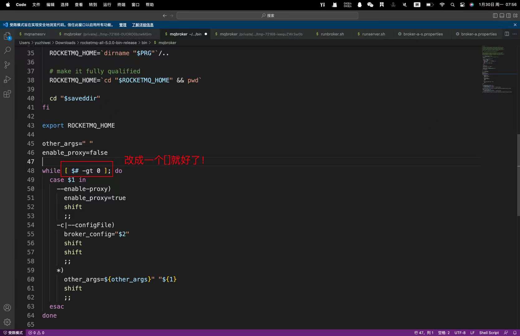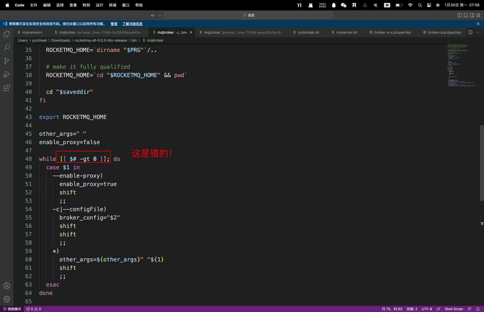 仔细一看,两个方括号,前面也标识出了报错的文件在哪里,就是那个bin文件夹下main的mqbroker文件,我们进去查看一下,发现,第48行果然是有两个方括号!