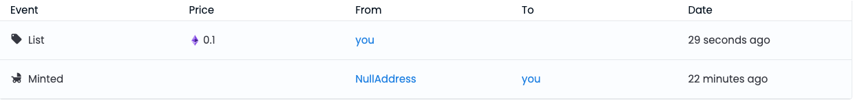 这个NFT就可以在平台上交易了,关于这个NFT的历史交易信息也会显示出来: