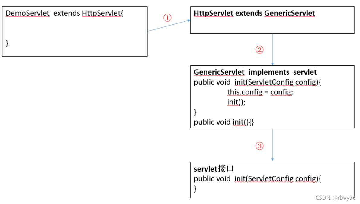 注意: 在GenericServlet中执行public void init(ServletConfigconfig)方法的时候,又调用了自己无惨无方法体的init()方法,其目的是为了方便开发者,如果开发者在初始化的过程中需要实现一些功能,可以重写此方法
