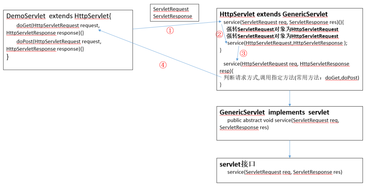②:到父类HttpServlet中发现有此方法,则直接调用此方法,并将之前创建好的两个对象传入