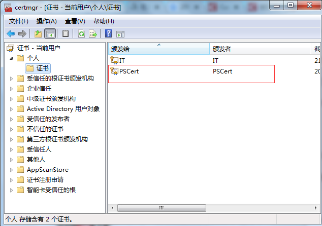 在控制台菜单,开始-》运行-》打开certmgr.msc证书控制台