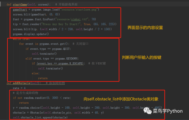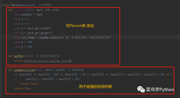 在障碍物类中,类的初构造函数中,主要设置了类对象的显示图像(self.surface)、坐标信息(self.x、self.y)和长宽信息(self.w、self.h)。而self.getPos函数用来返回当前对象的坐标和长宽信息,self.judgeCollision函数则是用来进行物体的碰撞检测。