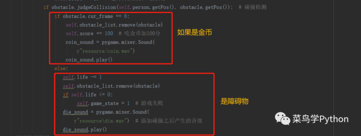 如果判断是金币的话,则用户的得分+100,金币被吃掉。否则的话,用户的生命值减一,障碍物消失掉。