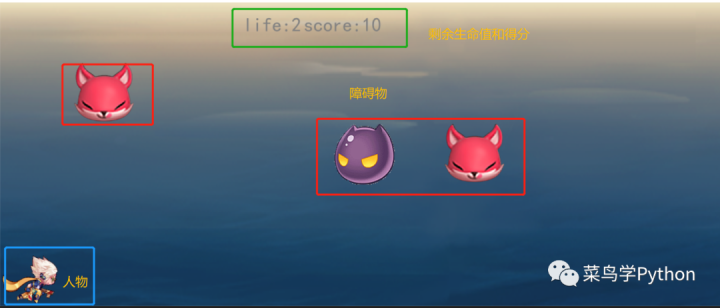 上图中,被红色框框住的就是障碍物,可以看到,障碍物之间有着不同的高度坐标,以及不同的间隔宽度,这样才能为跑酷人物带来不同的难度挑战。人物则是被蓝色框框住的目标,而位于画面正上方,被绿色框框住的则是“剩余生命值和得分”的信息。