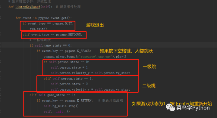 上图中,我们可以看到当用户输入空格键时,如果人物当前的state是0,则人物要完成一级跳,如果人物当前的state是1,则人物要完成二级跳。如果当前self.game_state是1,表示人物已经死亡,那么当用户输入“Enter”键时,游戏将重新开始。