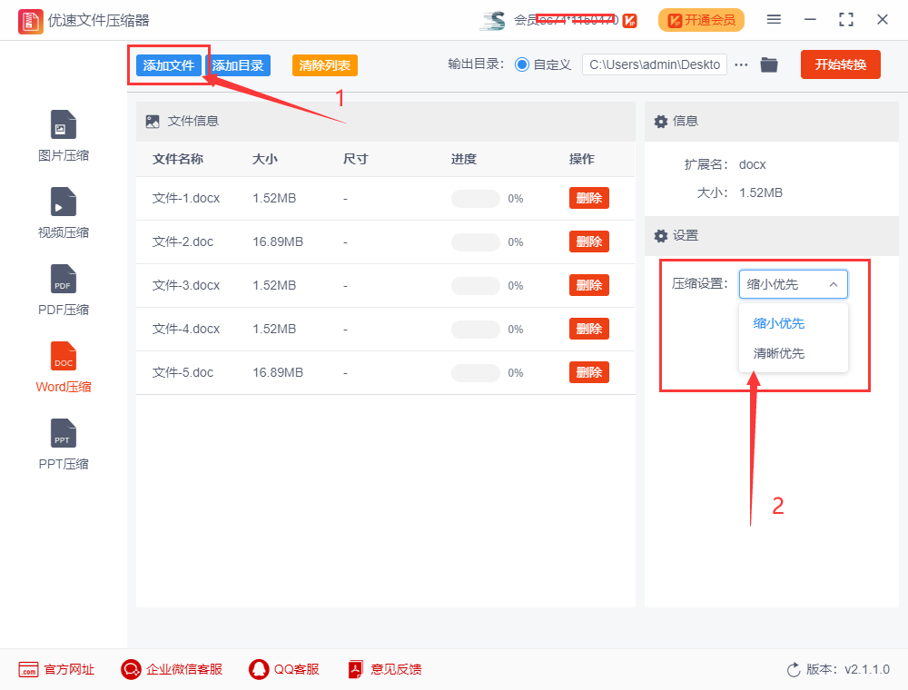 点击【添加文件】蓝色按钮,将需要压缩的word文件添加到软件中,也可以直接将word文件拖入软件进行添加;然后进行压缩设置,选择“清晰优先”或者“缩小优先”。