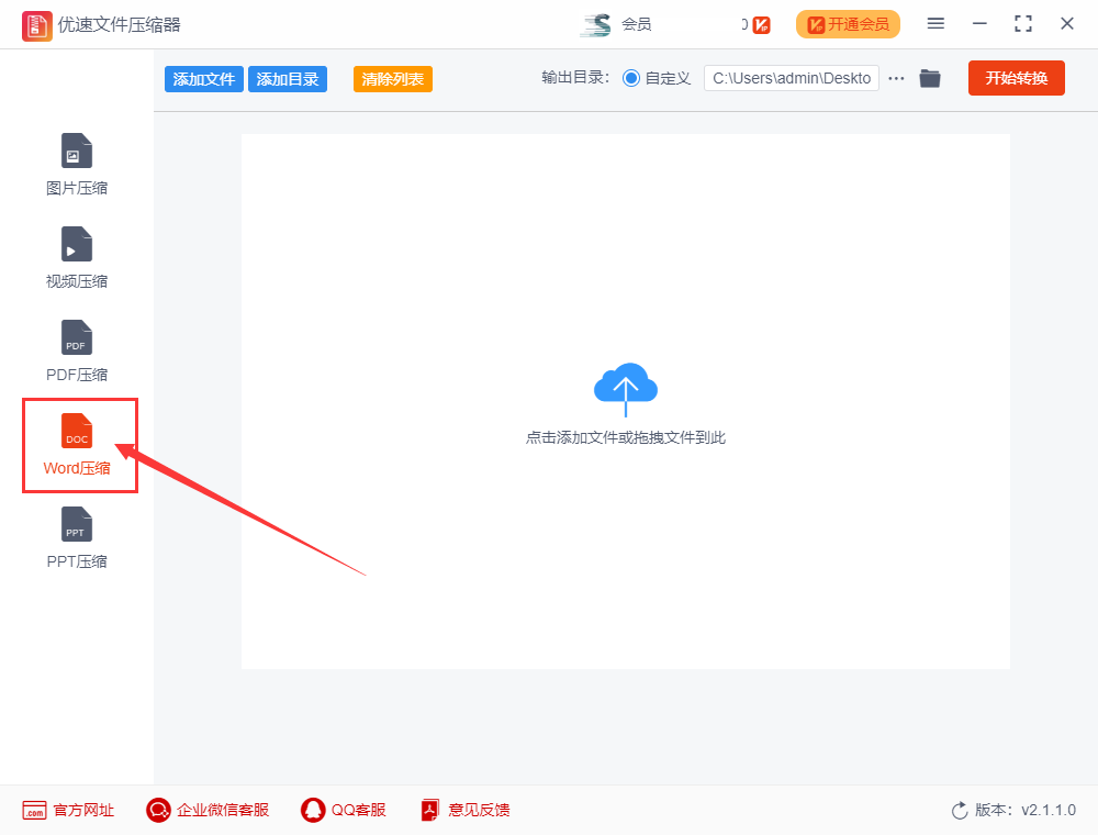 先打开电脑,然后下载“优速文件压缩器”工具并安装使用。左边列表中可以看到有五个功能,选择里面的【word压缩】功能选项,进入下一步操作。