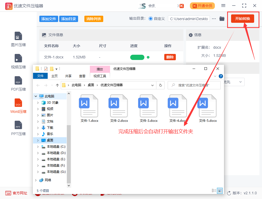 点击软件右上角的【开始转换】按钮,就能启动软件了。稍等片刻完成压缩后,软件会自动打开输出文件夹,方便我们查看。