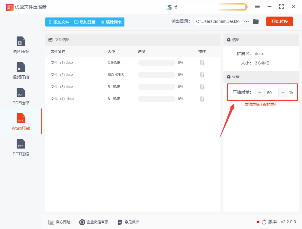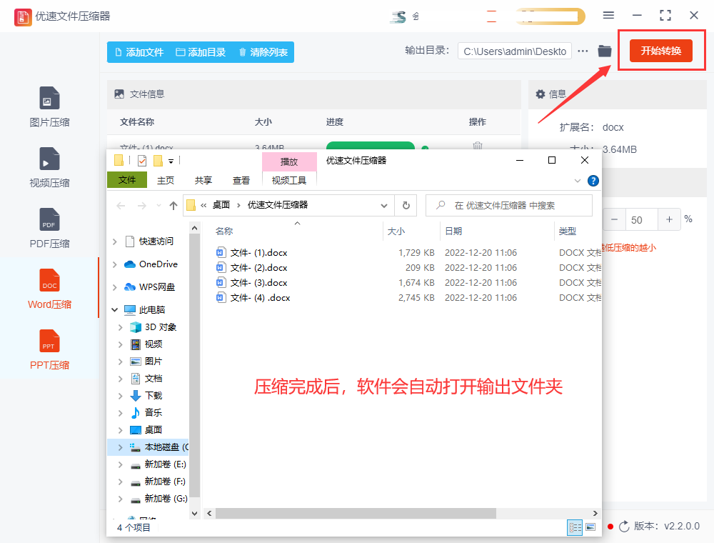 第4,质量压缩值设置成功后,点击【开始转换】按钮,接着软件就启动了压缩word的程序,并在压缩结束后自动弹出打开输出文件夹,这样用户可以在第一时间查看到压缩好的word文档。
