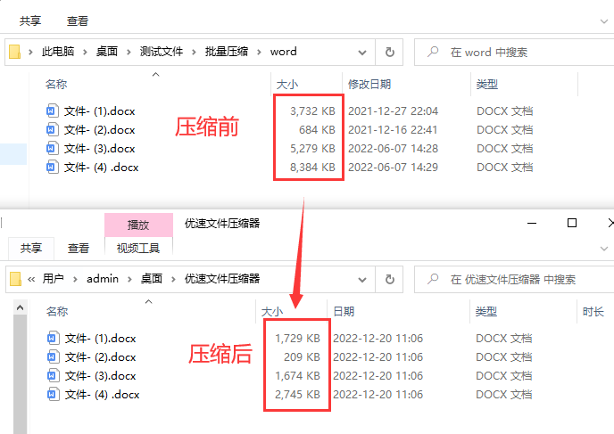 第5,为了验证压缩效果,我们需要将压缩前后的word文件大小进行对比,如图所示,这样我们可以明显的看到压缩后的word文档比压缩前确实小了很多,说明我们的压缩方法很成功,很有效。