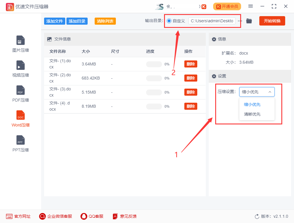 步骤3、根据自己的要求,选择“缩小优先”或者是“清晰优先”;之后设置输出目录,用来保存压缩后的word文档。