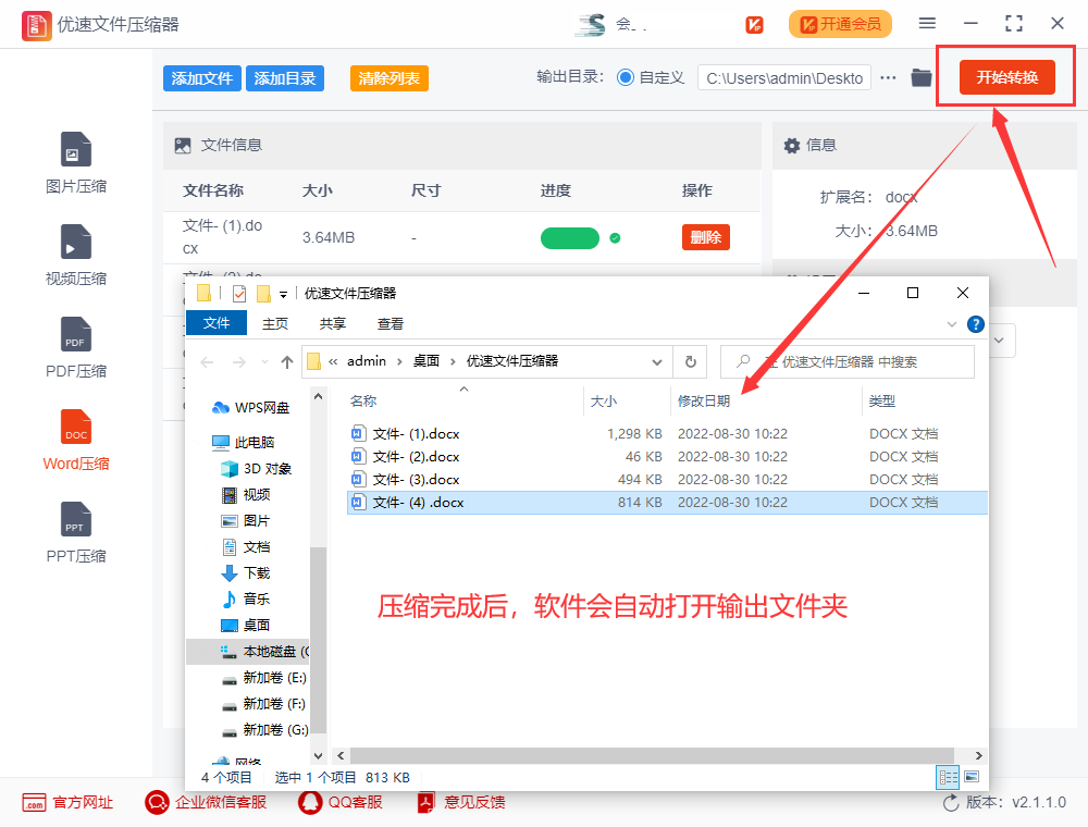 步骤4、最后点击【开始转换】红色按钮,软件启动压缩;待到压缩完毕软件会立即打开输出文件夹,用户可以直接查看压缩好的word文档;