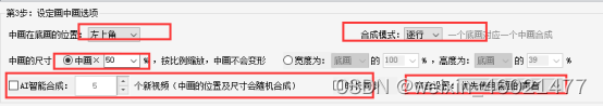 选下中画在底画的位置:中画的尺寸:合成模式:视频时长:声音设置:AI智能合成几个新视频等等,都可以根据自己需要来设置,设置不样,每次合并视频出视频呈现的效果也不一样。可以多动手操作试下效果哦。总有一种效果是适合自己哦