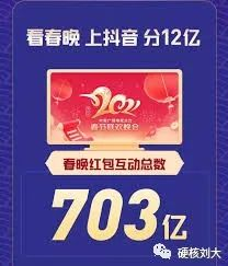 2021年春节,抖音在央视春晚撒下的12亿红包,掀起了不小的水花。官方数据显示,春晚期间,抖音红包总互动次数达703亿,春晚直播间累计观看人次12.21亿。