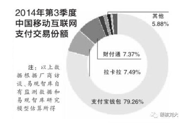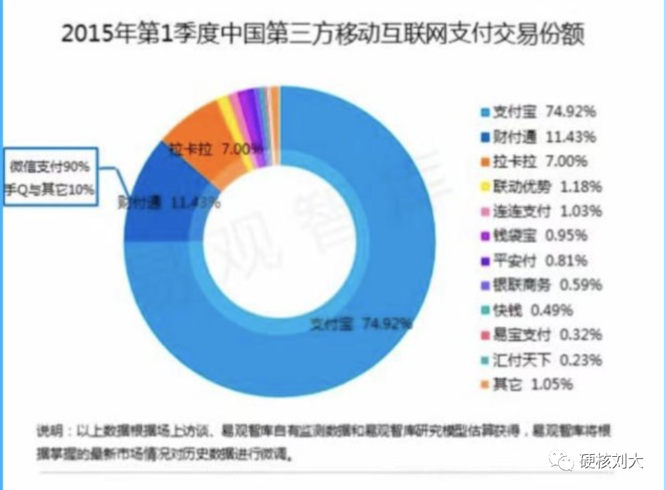 2015年,互联网+成为全社会热词,也就是那年的春晚,品牌赞助商从美的变成了腾讯,互联网企业从此开启了春晚品牌赞助之旅。那年腾讯与春晚开启跨屏合作,推广微信红包,春晚之前,微信只有不到800万人的支付用户,几乎在一夜之间,亿级用户完成了银行卡绑定。根据易观发布的数据显示,2014年三季度时,支付宝以79.26%的市场份额,成为中国第三方移动支付的绝对霸主,推出微信支付的财付通,市场份额仅有7.37%,位列第三。到了2015年一季度,财付通以11.43%的份额跃升第二,而支付宝的市场份额开始下降,降至74.92%,而且这仅仅只是一个开始,微信支付从此打破了支付宝一统天下的局面,追赶势头明显。
