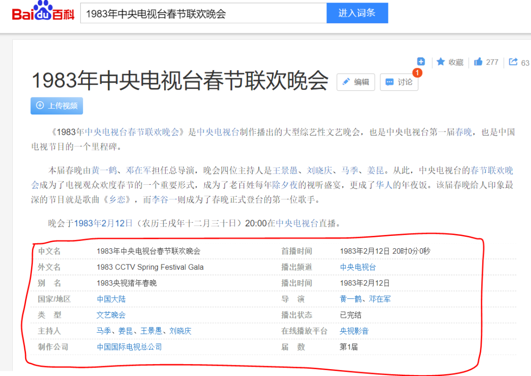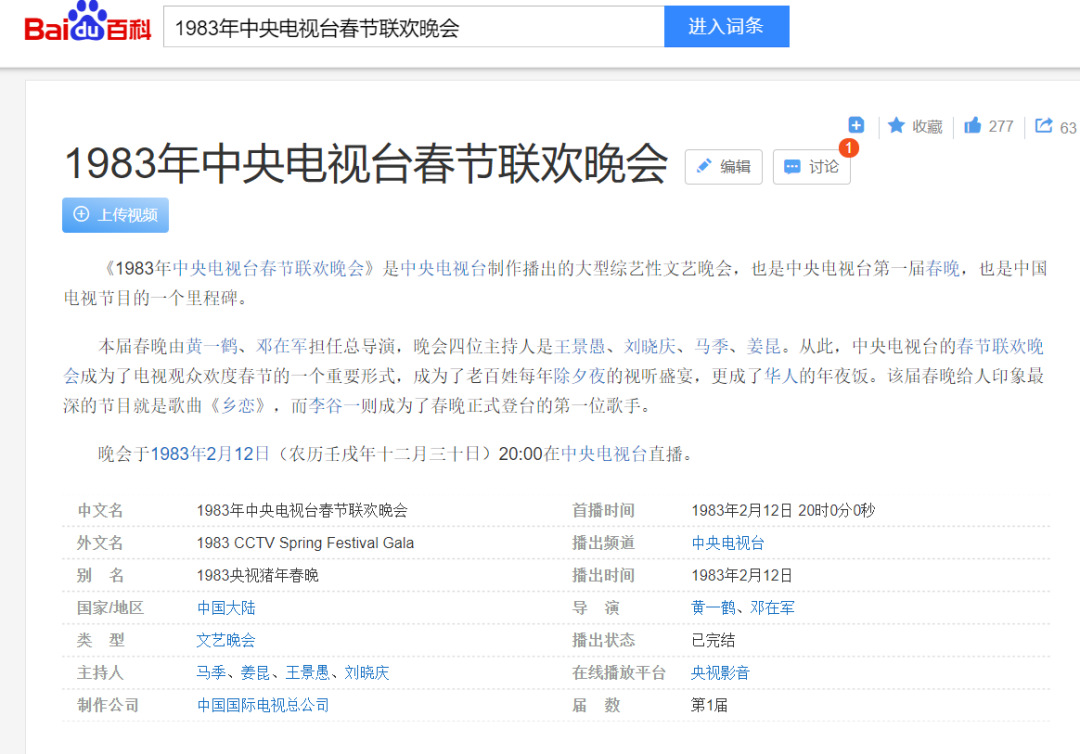 数据来源百度百科,春晚是在1983年开始的,直接搜索“1983年中央电视台春节联欢晚会”就可以看到结果: