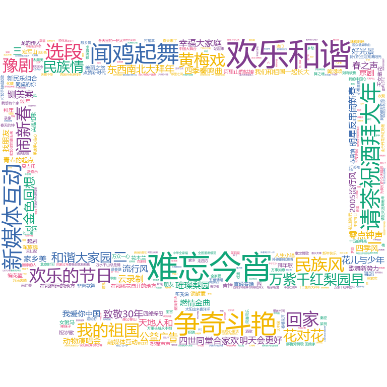 春晚节目形形色色,那节目名称,画一个词云来看看主要都喜欢使用什么表扬来作为春晚的节目呢: