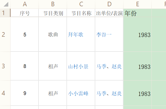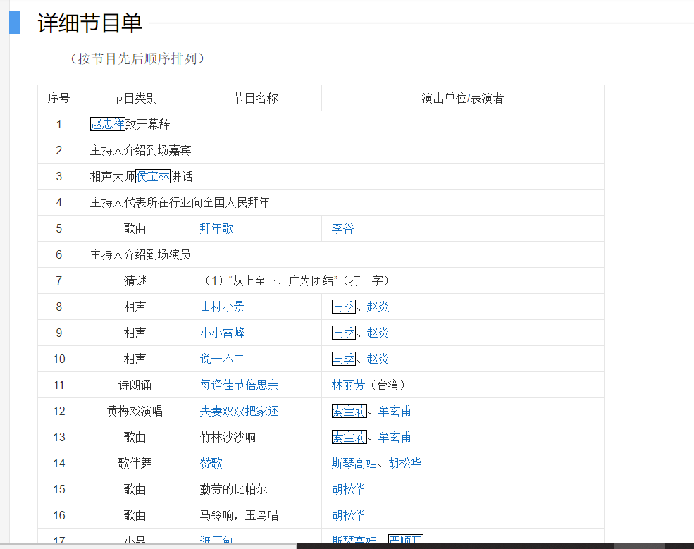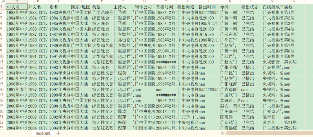 爬虫爬取每年晚会的基础信息,不算很难,但节目数据,是小编手动复制的,因为实在是太乱了,每一年的格式可能都不一样,最后得到的结果: