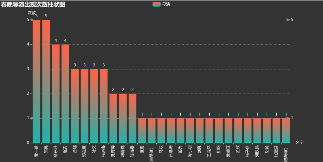 导演出现次数最多的黄一鹏导演为春晚付出了 5 次,其他导演分布在 1-4 次。