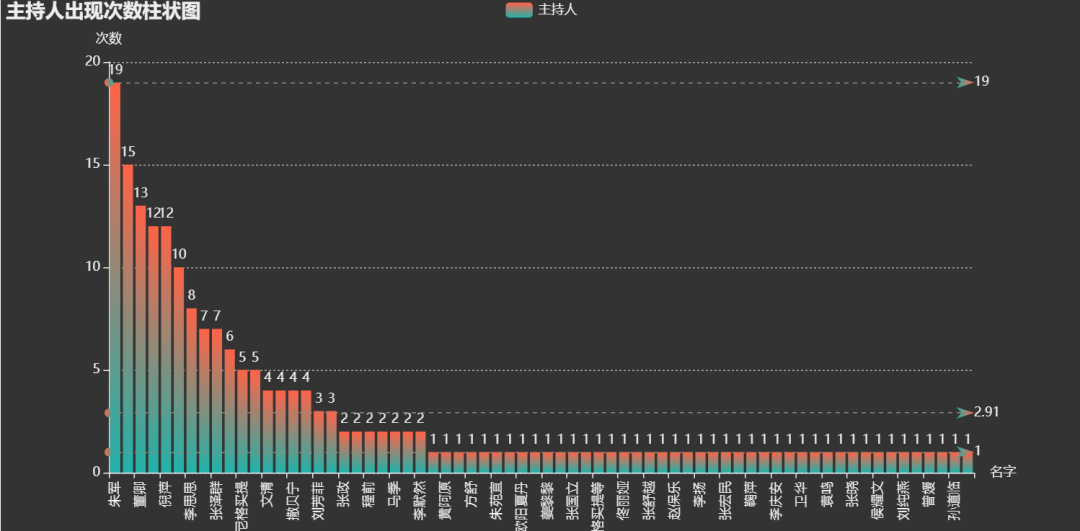 春晚当然离不开主持人主持节目咯,哪些主持人主持春晚的次数较多呢,绘制柱形图查看一下: