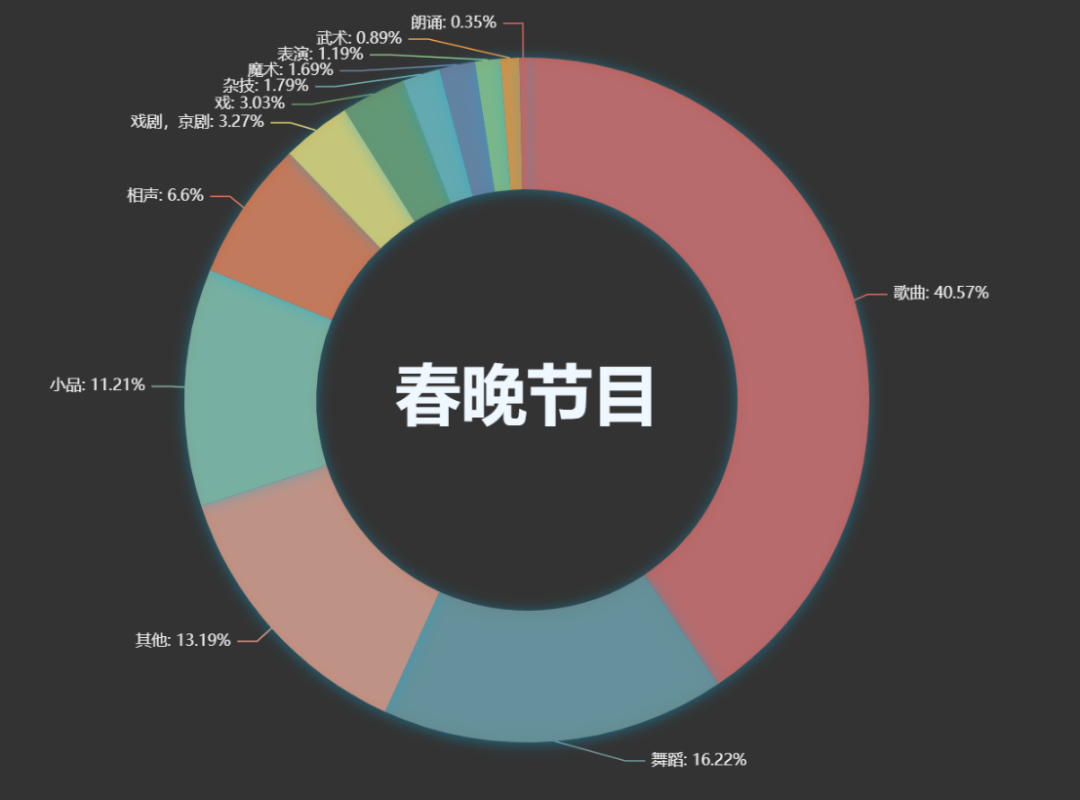 最多的类型当然是歌曲类节目,以前看过的春晚就已经感觉歌曲类的特别多了,通过数据再次证实了哈哈哈。