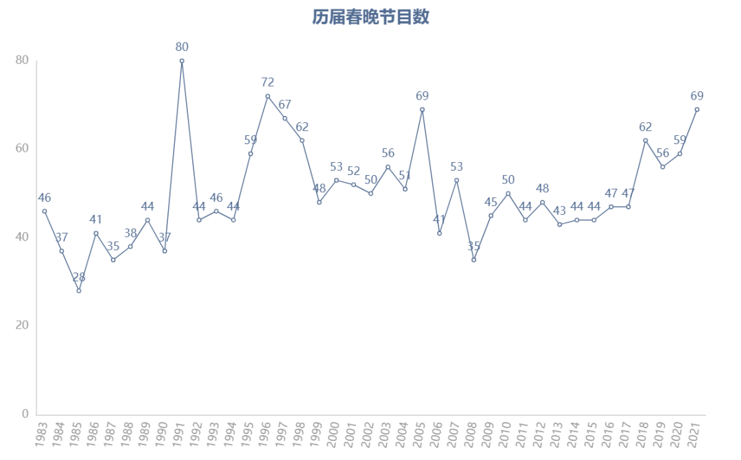 在这些导演辛勤的付出后,那每年的春晚节目都有多少,来看一看每年春晚节目走势: