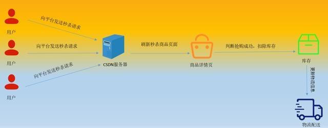 用户在秒杀页面进行点击立即抢购,即是向平台发送了秒杀的请求,平台服务器做出响应、判断库存等,判断用户抢购成功之后系统扣除库存、修改库存数量、生成用户订单、平台进行发货、物流配送等操作。