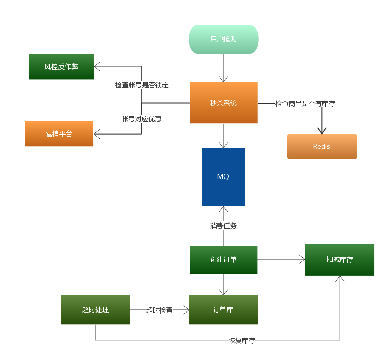秒杀其实可以当做高并发系统来处理,在这个时候,可以考虑从业务上做兼容,将同步的业务,设计成异步处理的任务,提高网站的整体可用性