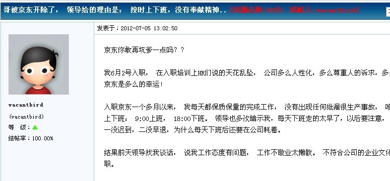 网友发帖称:被京东开除,领导的理由是:按时上下班,没有奉献精神“入职京东一个多月,每天都保质保量完成工作,没有出现任何纰漏生产事故,唯一就是每天准时上下班:9:00上班,18:00下班。结果前天领导找我谈话,说工作态度有问题,不敬业太懒散。不符合公司企业文化,让我主动离职。”