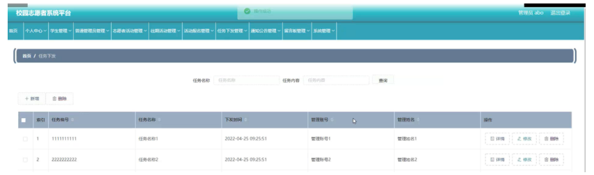 任务下发管理,在任务下发管理页面可以查看索引、认为编号,任务名称,下发时间,管理账号、管理姓名等内容进行详情,修改和删除操作,如图5-13所示。