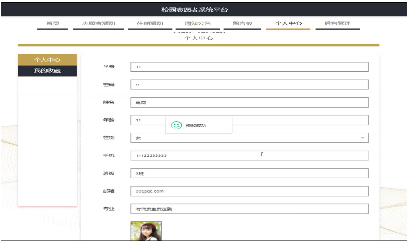 个人中心,在个人中心页面通过填写学号,密码,姓名年龄,性别,手机,班级,邮箱,专业,上传图片等内容进行更新信息操作,还可以对我的收藏进行详细操作;如图5-6所示。