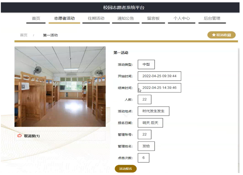 志愿者活动,在志愿者活动页面可以查看活动类型,开始时间,结束时间,人数,活动地点,报名日期,管理账号,管理姓名,点击次数等内容进行活动报名操作,如图5-4所示。