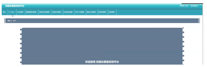 管理员登录系统后,可以对首页、个人中心、学生管理、普通管理员管理、志愿者活动管理、往期活动管理、活动报名管理、任务下发管理、通知公告管理、留言板管理、系统管理等功能进行相应操作,如图5-7所示。