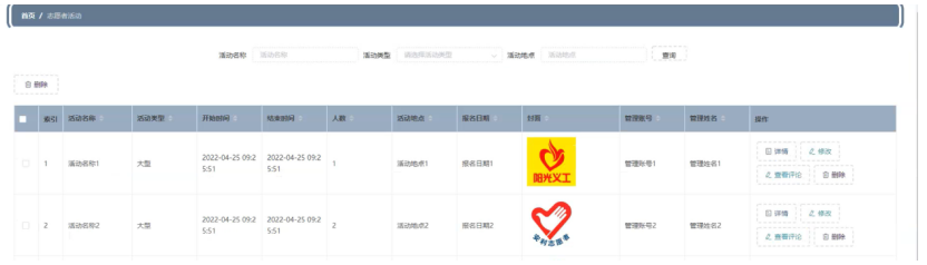志愿者活动管理,在志愿者活动管理页面可以查看索引、活动名称、活动类型、开始时间、结束时间、人数、活动地点、报名日期、封面、管理账号、管理姓名等内容,并进行详情,修改,查看评论或删除等操作,如图5-10所示。