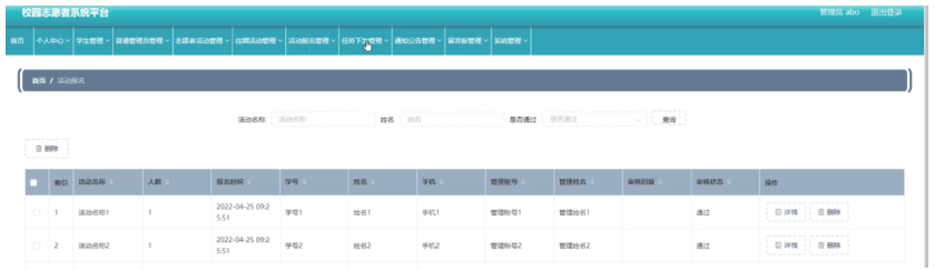 活动报名管理,在活动报名管理页面可以查看索引、活动名称、人数、报名时间、学号、姓名、手机、管理账号、管理姓名、审核回复、审核状态等内容,进行详情或删除等操作,如图5-12所示。