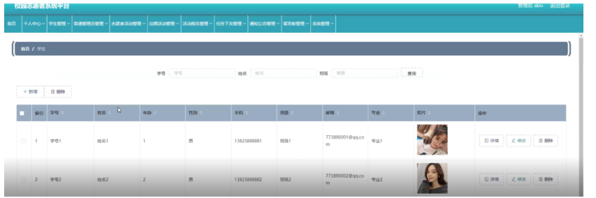 学生管理,在学生管理页面可以查看索引、学号、姓名、年龄、性别、手机、班级、邮箱、专业、照片等内容,并进行详情,修改或删除等操作,如图5-8所示。