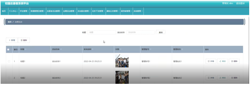 往期活动管理,在往期活动管理页面可以查看索引、标题、活动名称、发布时间、封面、管理账号、管理姓名等详细内容进行详情,修改和删除操作,如图5-11所示。