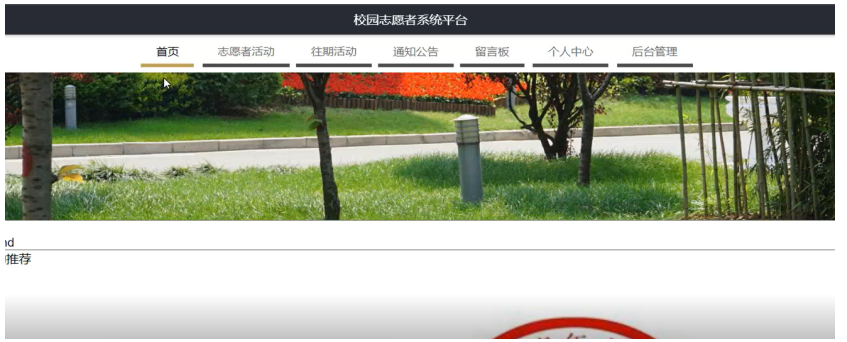校园志愿者系统平台,在系统首页可以查看首页、志愿者活动、往期活动、通知公告、留言板、个人中心、后台管理等内容进行详细操作,如图5-3所示。