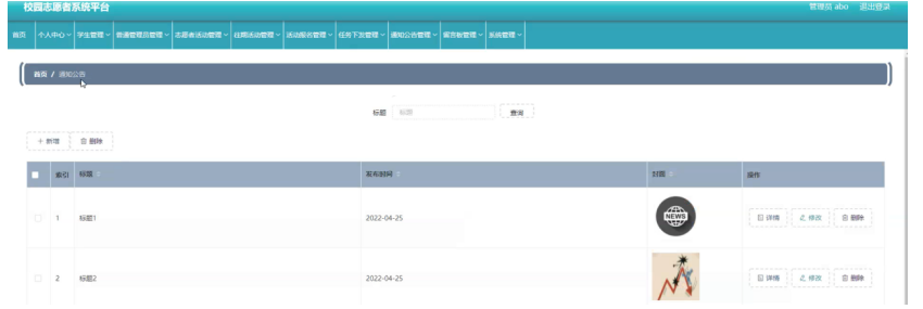 通知公告管理,在通知公告管理页面可以查看索引、标题、发布时间、封面等内容,进行详情或删除等操作,如图5-14所示。