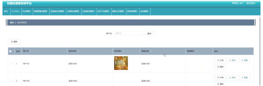 留言板管理,在留言板管理页面可以查看索引、用户名,留言内容,留言图片,回复内容,回复图片等内容进行详情,修改,回复和删除操作,如图5-15所示。