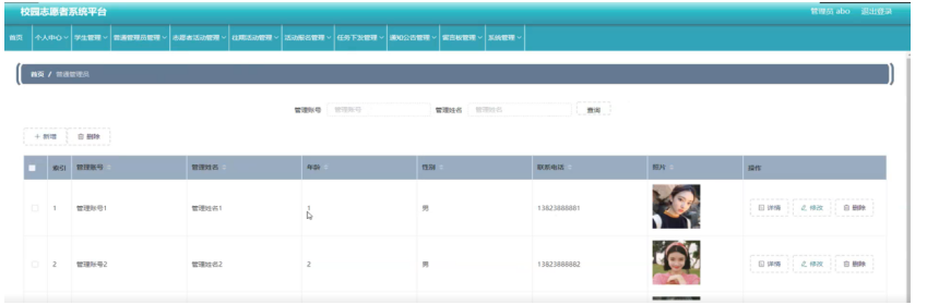 普通管理员管理,在普通管理员管理页面可以查看索引、管理账号、管理姓名、性别、年龄、联系电话、照片等内容,并进行详情,修改或删除等操作,如图5-9所示。